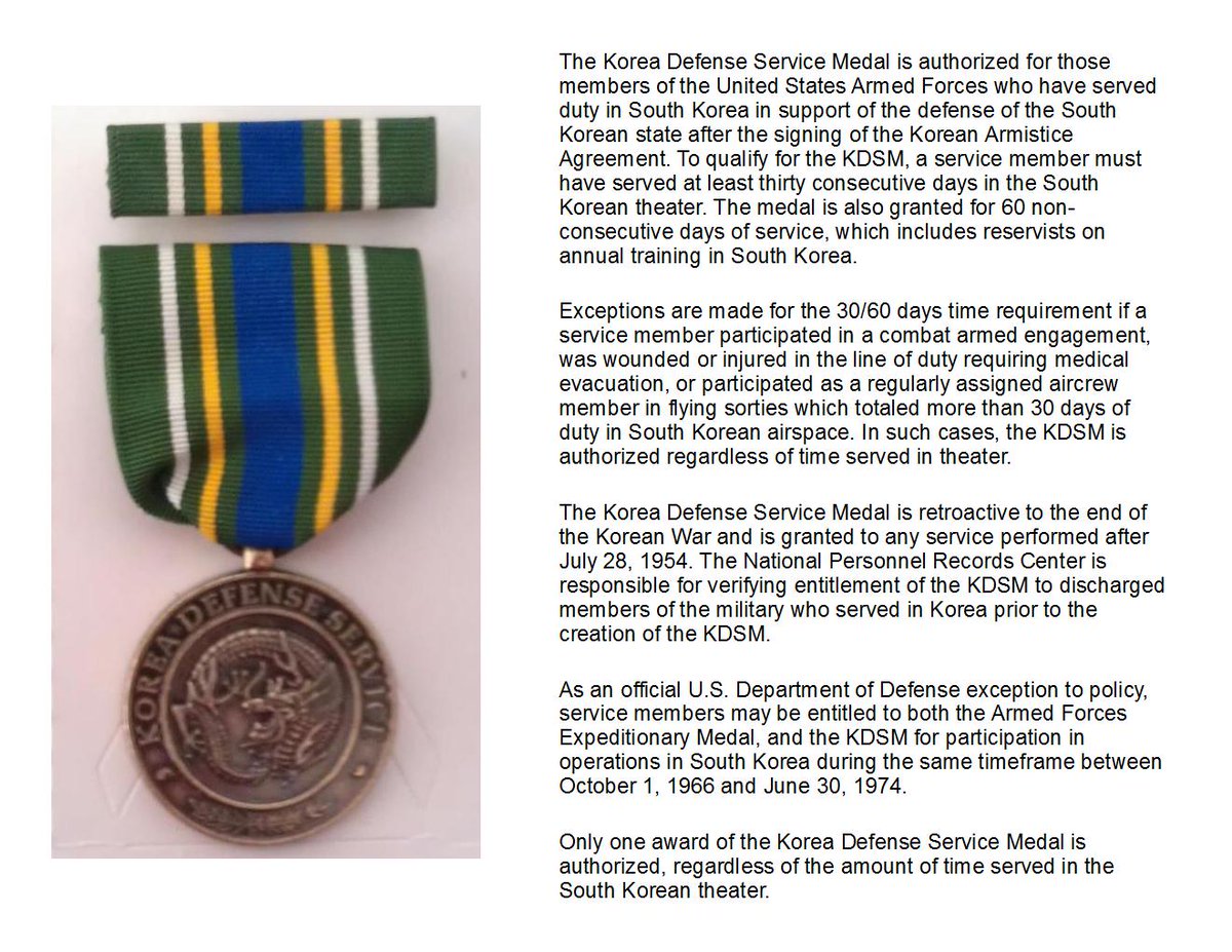 IS WOUNDED OR INJURED IN THE LINE OF DUTY AND REQUIRES. KOREAN DEFENSE SERVICE MEDAL SELF CERTIFICATION DOCUMENT By this document I hereby request the Korean Defense Service Medal KDSM and correction of my DD 214 if applicable and my official military record. To qualify for this medal a member of the armed forces must have served at least 60 non-consecutive days in South KoreaThe medal was made retroactive to all members as far back as the end of the Korean war in July of 1954Only one award is authorized regardless of time served in the Korean theater.